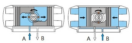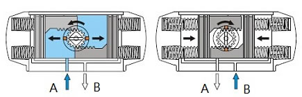 | 氣口B排出同時(shí)使兩活塞齒條同步帶動(dòng)輸出軸 (齒輪)順時(shí)針?lè)较蛐D(zhuǎn)。 |